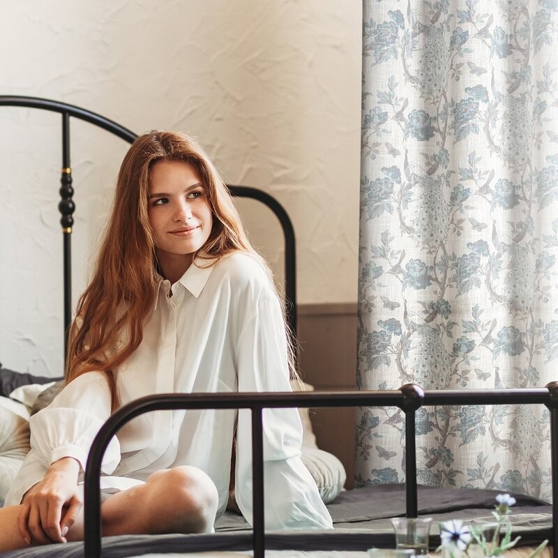 Zasłona KARLA z tkaniny z dodatkiem lnu w stylu eko zdobiona nadrukiem delikatnych kwiatów