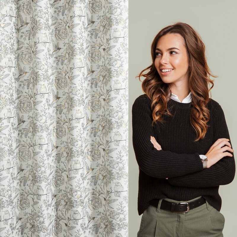 Gotowa zasłona w stylu eko, wykonana z tkaniny o wyraźnym, naturalnym splocie, to propozycja dla osób ceniących przytulny i ekologiczny charakter wnętrz. Całość zdobi motyw roślinny, który wprowadza do pomieszczenia świeżość i harmonijny, naturalny klimat. Dodatkowo nadruk uzupełniono subtelnymi, błyszczącymi złotymi akcentami, które nadają zasłonie elegancji i lekkości, przyciągając wzrok. Zasłonę zawiesza się przy pomocy przelotek, co ułatwia przesuwanie materiału i równomierne układanie fałd. Doskonała do salonu, sypialni czy przytulnego kącika, tworząc wyjątkowy, stylowy efekt w naturalnej aranżacji wnętrza.