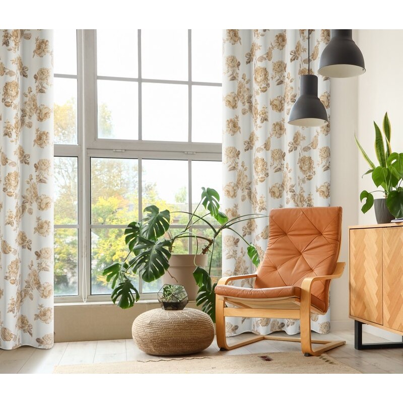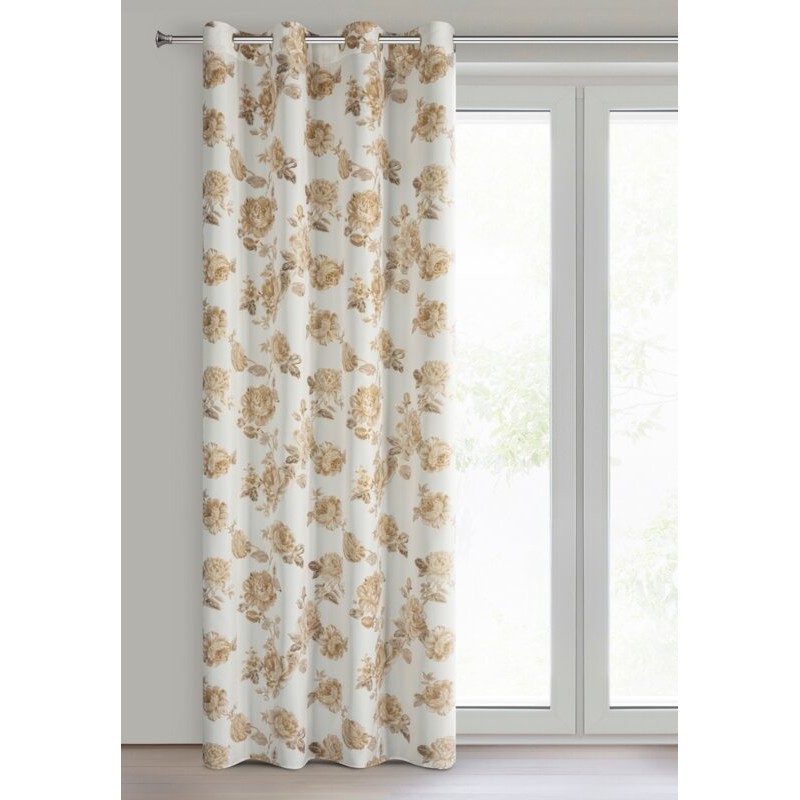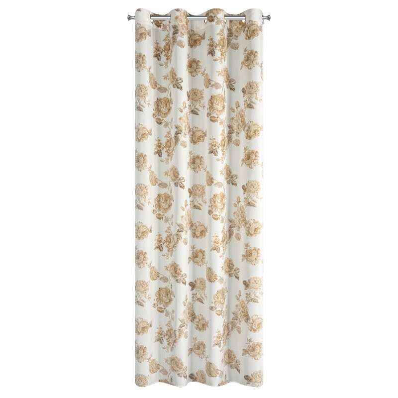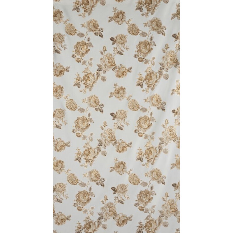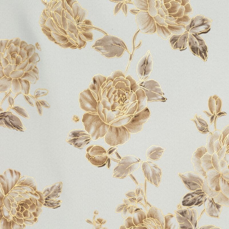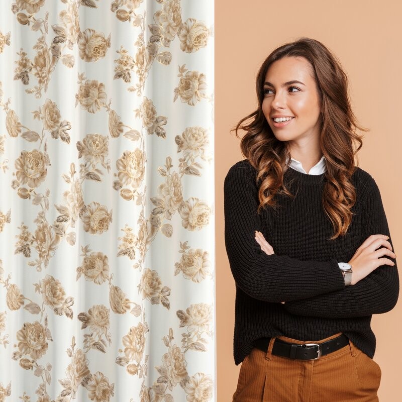 Elegancka zasłona wykonana z wysokiej jakości tkaniny Oxford, która łączy trwałość i delikatny połysk z subtelnym, luksusowym wyglądem. Jej powierzchnię zdobi beżowy nadruk róż uzupełniony złotymi, lśniącymi akcentami, które dodają wnętrzu wyjątkowego blasku. Białe tło materiału podkreśla lekkość i świeżość wzoru, sprawiając, że zasłona doskonale wpasuje się zarówno w klasyczne, jak i nowoczesne aranżacje.