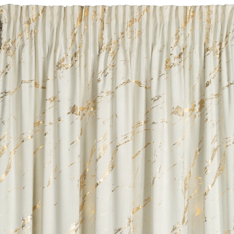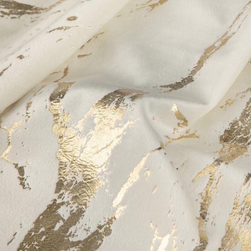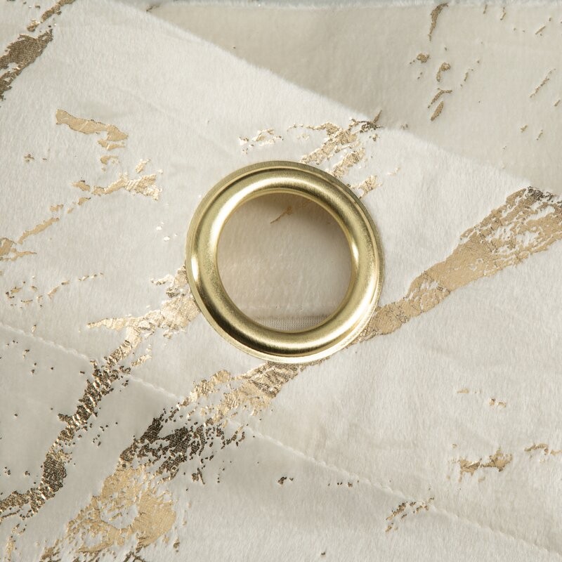Podkreśl szyk eleganckiego wnętrza welwetowymi zasłonami z szampańskim marmurowym wzorem. Zasłona MOLLY z przecieranym złotym nadrukiem na miękkiej welwetowej tkaninie dodaje wnętrzu szyku i modnie je dekoruje. Grubsza i puszysta tkanina o gęstym splocie i gramaturze 200 g/m2, dobrze kryje okno, zapewniając prywatność oraz przyjemny klimat w dekorowanym pomieszczeniu. Zasłona wspaniale udekoruje nowoczesne wnętrze, szczególne to zaaranżowane w stylu glamour, lub w stylu klasycznym dodając pomieszczeniu niezwykłego blasku. Stosując się do instrukcji konserwacji masz pewność, że po praniu tkanina nie kurczy się ani nie wymaga pracochłonnego prasowania.