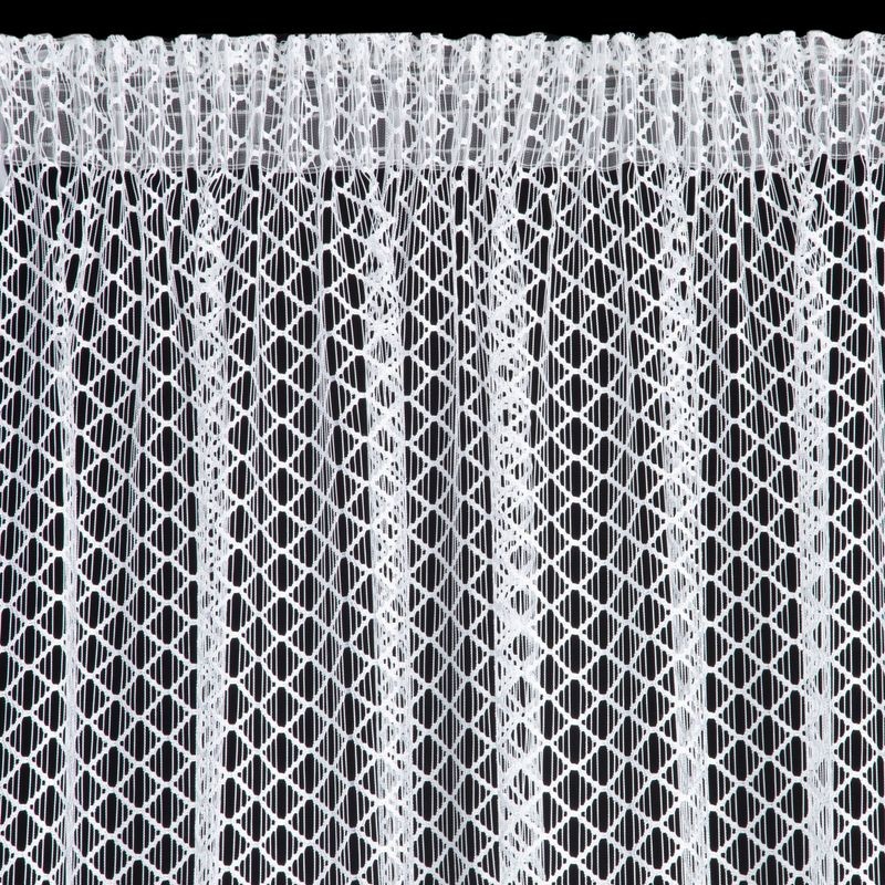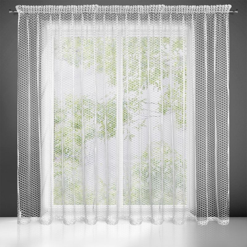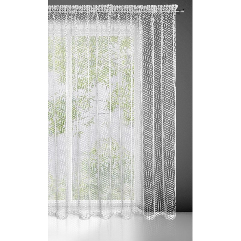 Nowoczesna firana z nieregularnej siateczki o subtelnym połysku i róznej wielkości oczek. Doskonała również w roli dekoracyjnej zasłony. Nie należy wybielać. szerokość: 300 cm, długość: 270 cm, kolor: biały, Gramatura: 120 GSM, Skład: 100% poliester