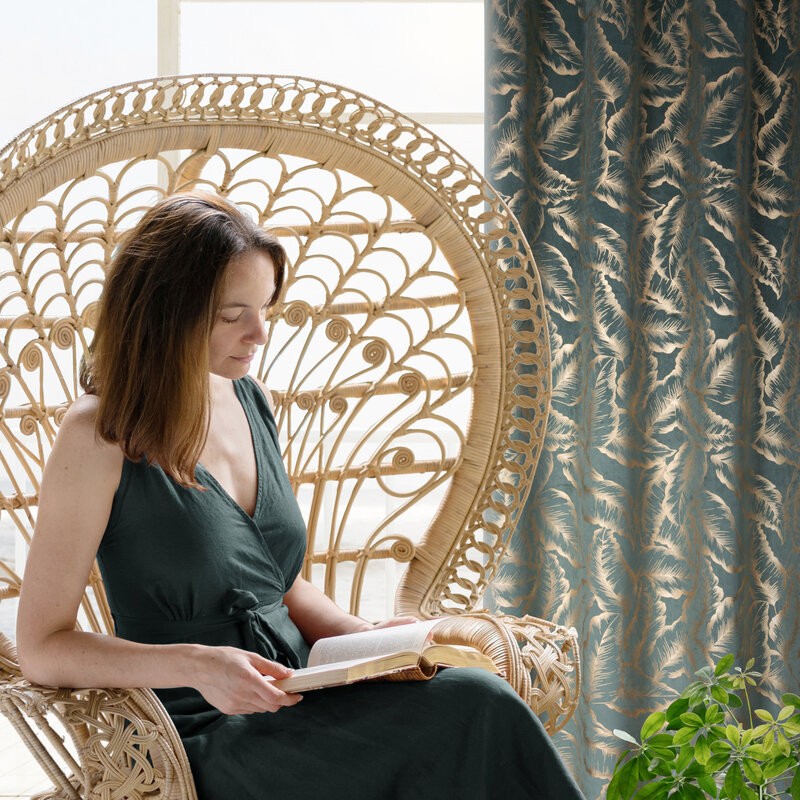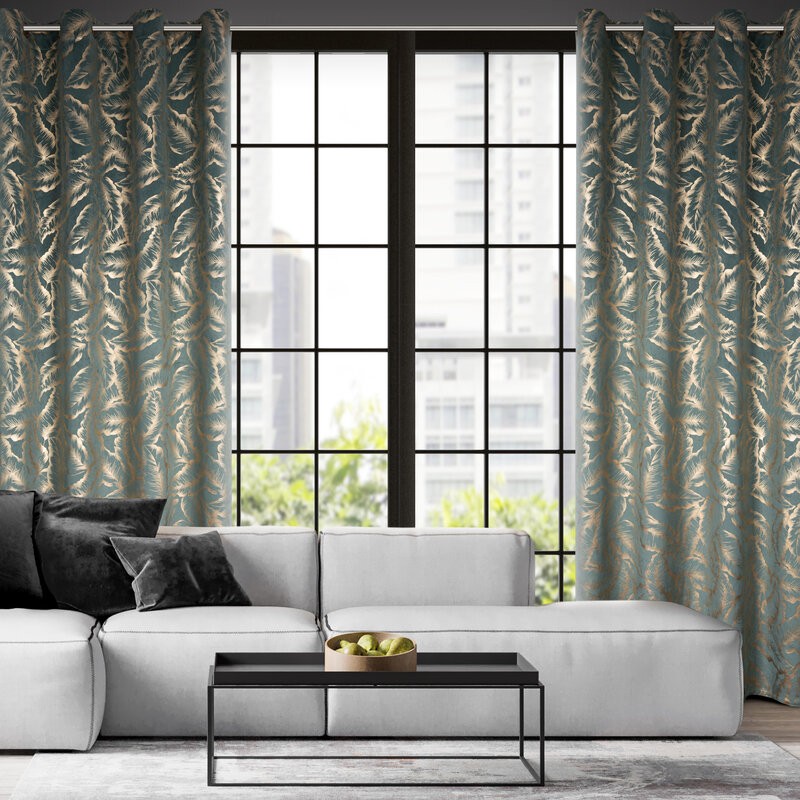 Ekskluzywna zasłona wykonana z miękkiego, aksamitnego welwetu, który nadaje wnętrzu przytulności i luksusowego charakteru. Tkanina została ozdobiona błyszczącym nadrukiem egzotycznych liści, wprowadzając do aranżacji nutę elegancji i stylu glamour. Głębia welwetu w połączeniu z lśniącymi elementami pięknie odbija światło, tworząc efektowną dekorację okna. Dzięki złotym przelotkom zasłona jest łatwa w montażu i efektownie układa się w miękkie fale.