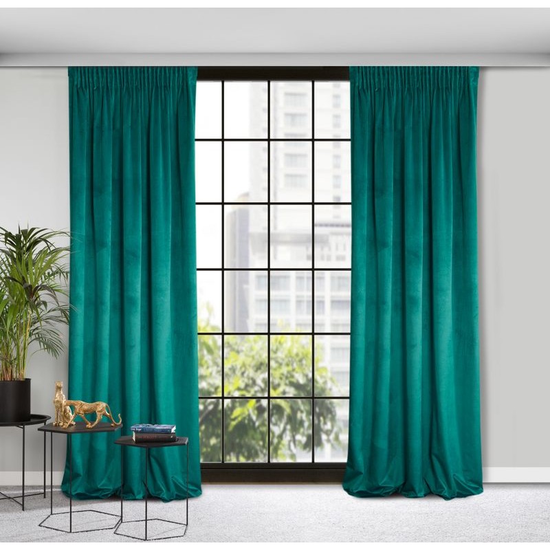 Miękka zasłona gotowa z jednokolorowego aksamitu o charakterystycznym dla welwetu połysku. Mięsista tkanina daje wysoki stopień zaciemnienia wnętrza. szerokość: 140 cm, długość: 250 cm, kolor: turkusowy, Gramatura: 215 GSM, Skład: 100% poliester