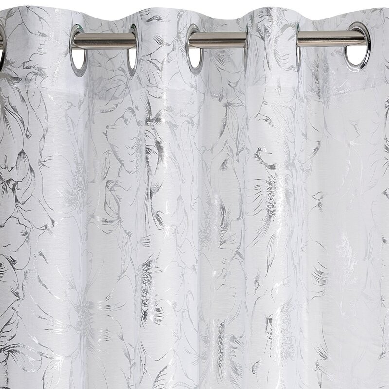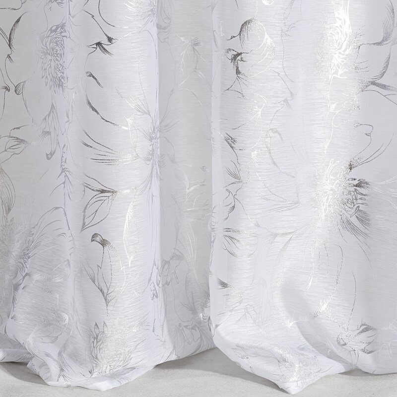 Firana FEZA z lekkiej etaminy rozjaśni Twoje wnętrze za sprawą srebrnych kwiatów na białej tkaninie. Półprzezroczysta tkanina pokryta błyszczącym metalicznym wzorem, świetnie zaprezentuje się jako dekoracja w nowoczesnych wnętrzach. Nadruk na tej firanie przedstawia srebrzyste kwiaty, które nadają jej wyjątkowy urok i delikatność. Kwiaty są równomiernie rozmieszczone na tkaninie, tworząc spokojny i harmonijny wzór. Srebrzysty kolor nadruku jest elegancki i subtelny, co nadaje firanie wyjątkowego stylu. Delikatna etamina subtelnie osłania okno i nie zaciemnia wnętrza, dzięki czemu jest ono doświetlone naturalnym światłem. Etamina jest idealnym wyborem do dekoracji okien, ponieważ pozwala na przepuszczanie światła do wnętrza, tworząc przyjemną atmosferę w pomieszczeniu. Praktyczne przelotki, zamocowane w górnej części zasłony zapewniają szybką i bezproblemową zmianę dekoracji, ponadto dzięki nim zasłony układają się w miękkie fale.