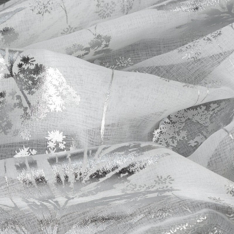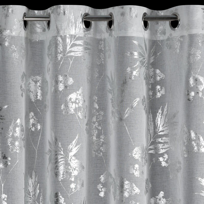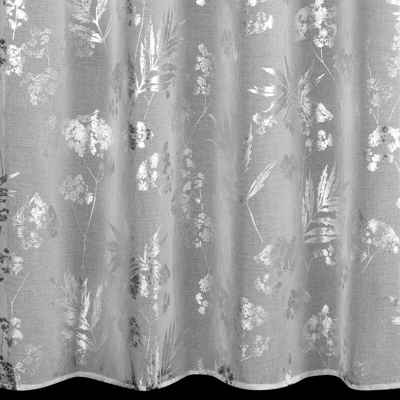 Firana uszyta z lekkiej, przewiewnej etaminy zachwyca subtelnym, lśniącym motywem roślinnym, który wprowadza do wnętrza elegancję i delikatny blask. Dzięki przelotkom firana układa się w estetyczne fale, co sprawia, że jest nie tylko funkcjonalnym elementem okna, ale również dekoracyjnym akcentem wnętrza.
