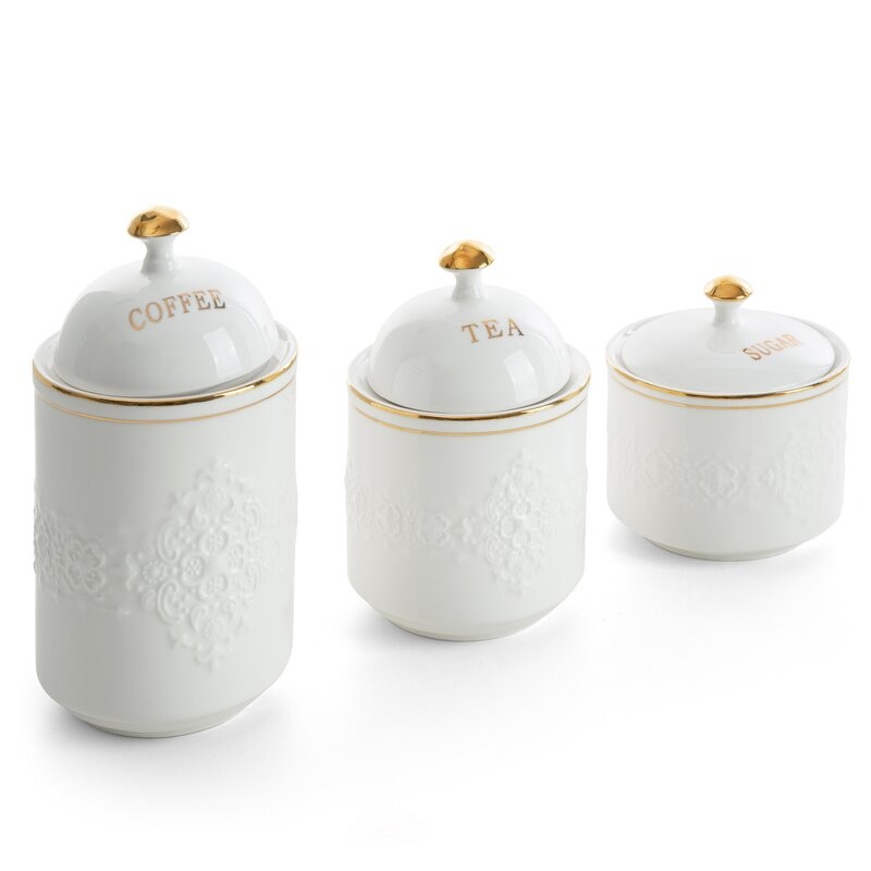 Komplet trzech ceramicznych pojemników to elegancki i praktyczny dodatek do kuchni. Każdy pojemnik jest dedykowany do przechowywania kawy, herbaty lub cukru, a wyraźny napis na froncie pozwala szybko zidentyfikować jego zawartość. Całość zdobi subtelny, dekoracyjny wytłaczany wzór, a złote akcenty nadają kompletu luksusowego i wyszukanego charakteru. To idealny zestaw dla osób ceniących połączenie funkcjonalności i eleganckiego designu.