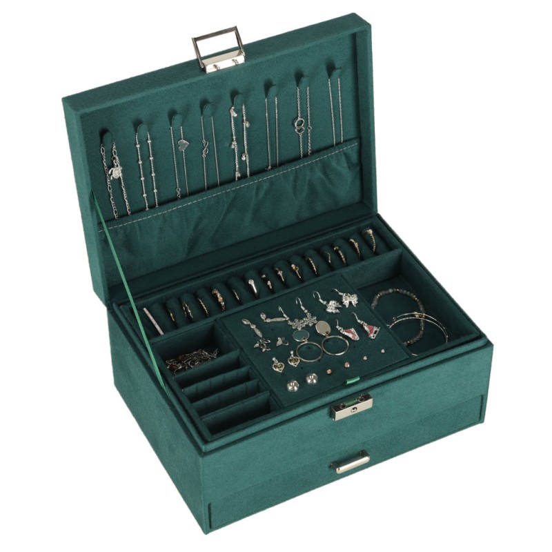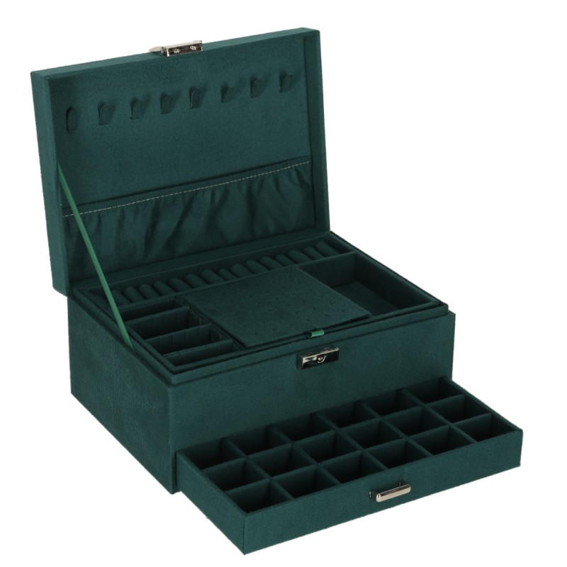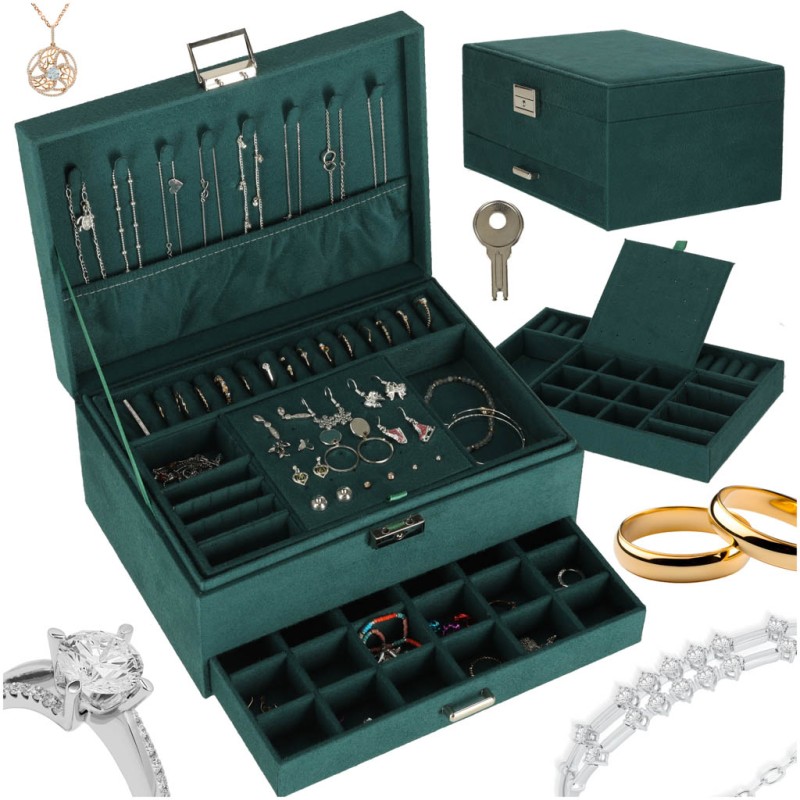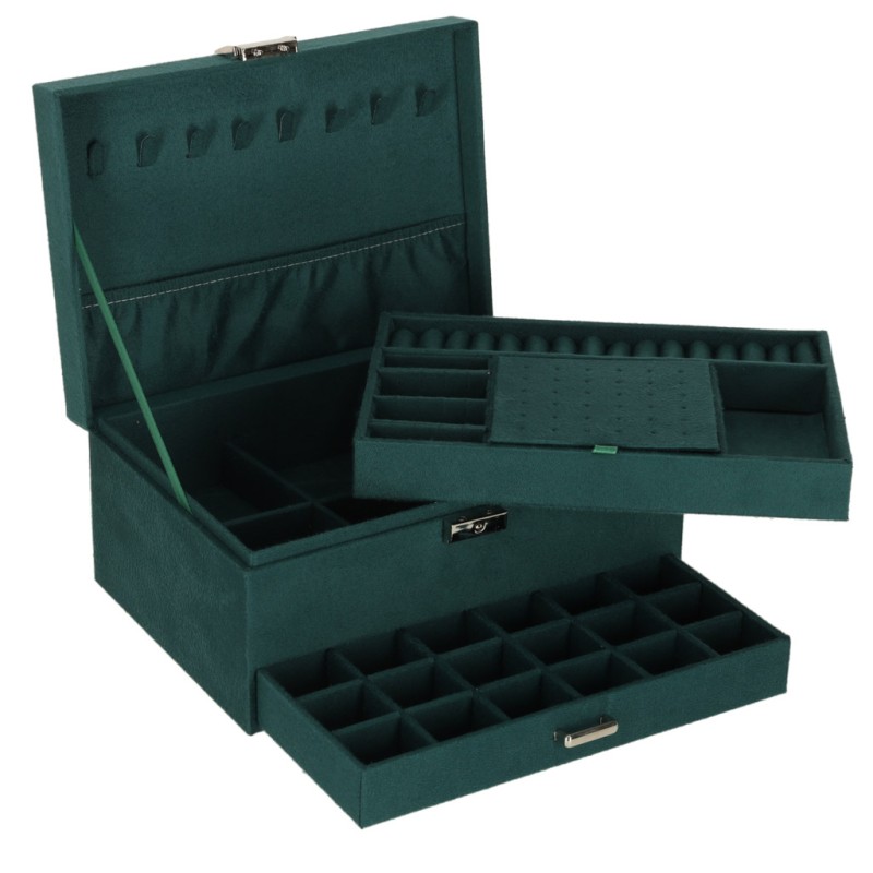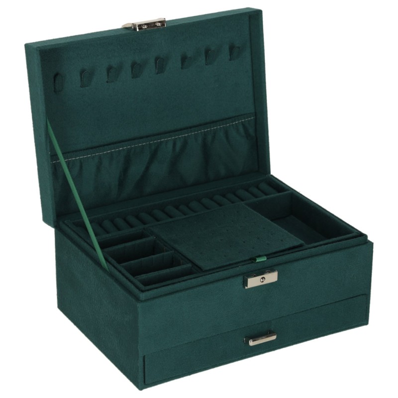 Zielona szkatułka na biżuterię z szufladą i wyjmowaną górną półką. Przegródki, haczyki i perforacje pomogą w kompleksowym ułożeniu dodatków. Wymiary: 24 cm x 11 cm x 17 cm, kolor: zielony