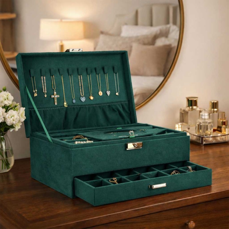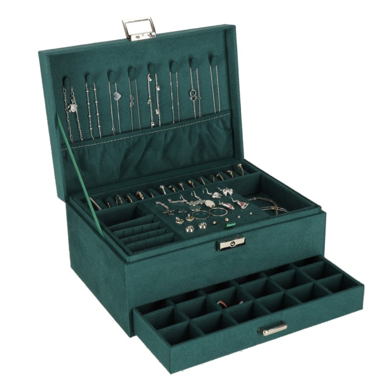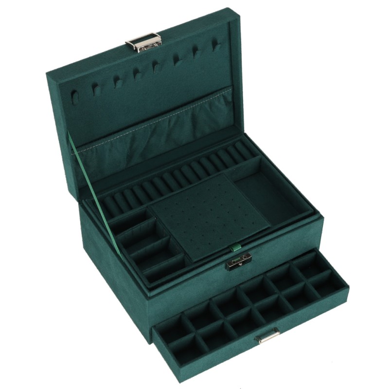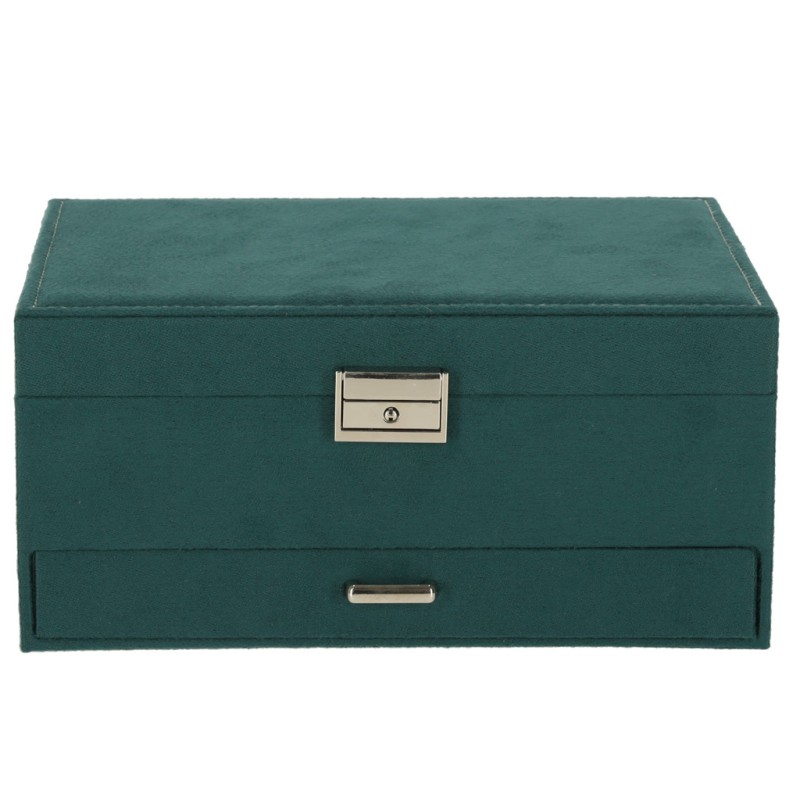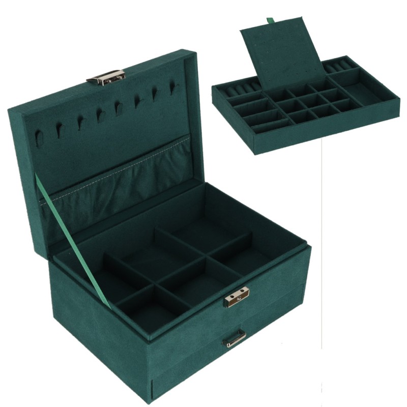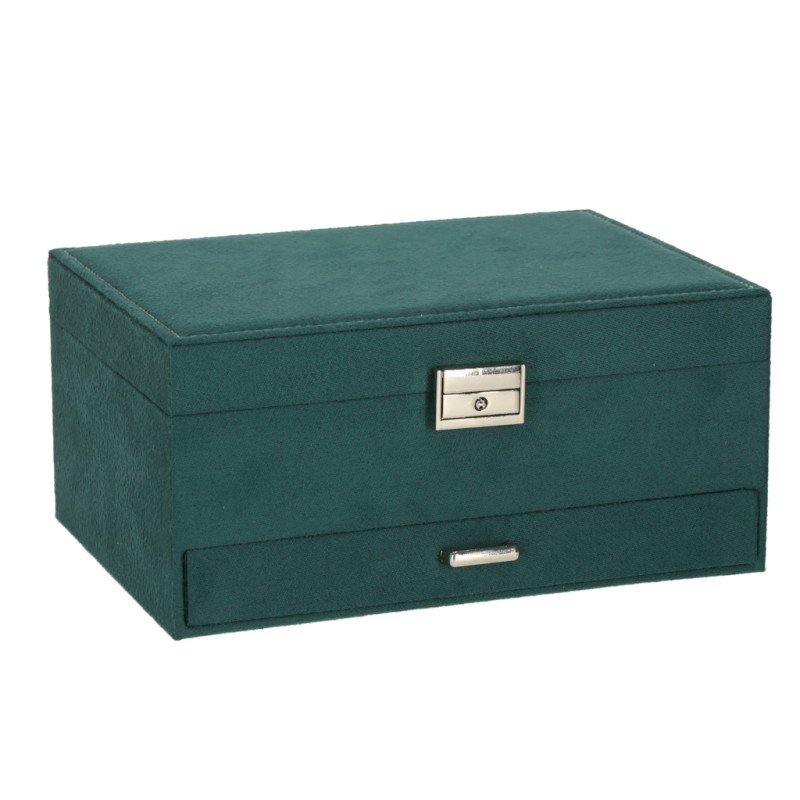 Zielona szkatułka na biżuterię z szufladą i wyjmowaną górną półką. Przegródki, haczyki i perforacje pomogą w kompleksowym ułożeniu dodatków. Wymiary: 24 cm x 11 cm x 17 cm, kolor: zielony