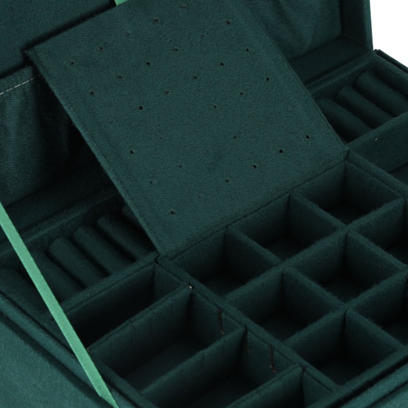 Szkatułka w eleganckim zielonym kolorze spodoba się zarówno estetom, jak i osobom preferującym praktyczne akcesoria. Posiada przegródki z wyjmowanymi ściankami, co pozwala komfortowo urządzić przestrzeń według własnych potrzeb.