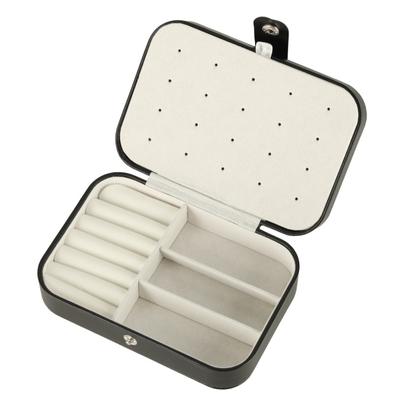 Ta szkatułka na biżuterię posiada podział na dwie przegrody, 12 miejsc na pierścionki, 10 miejsc na kolczyki typu sztyft, dodatkowe przegródki na drobiazgi oraz 5 haczyków z kieszonką na naszyjniki. Dzięki temu możesz wygodnie przechowywać swoją biżuterię, zachowując idealny porządek nawet przy większej kolekcji biżuterii.