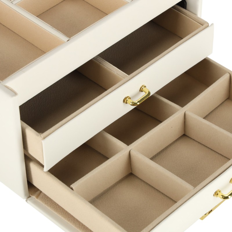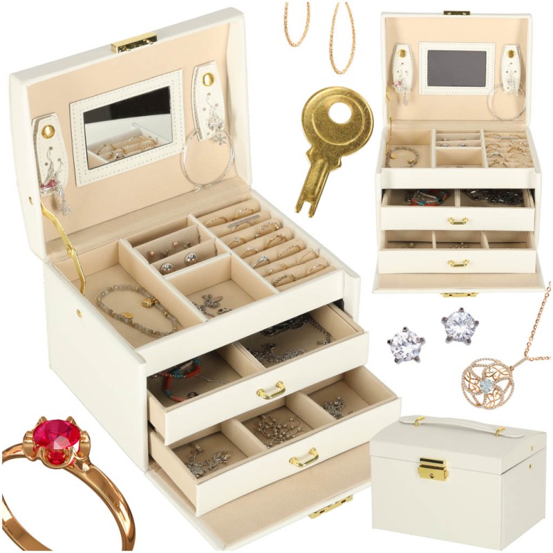 • Bezpieczne przechowywanie różnych elementów - praktyczne przegródki, pojemne szufladki i zamykany kluczyk gwarantują pełną ochronę biżuterii