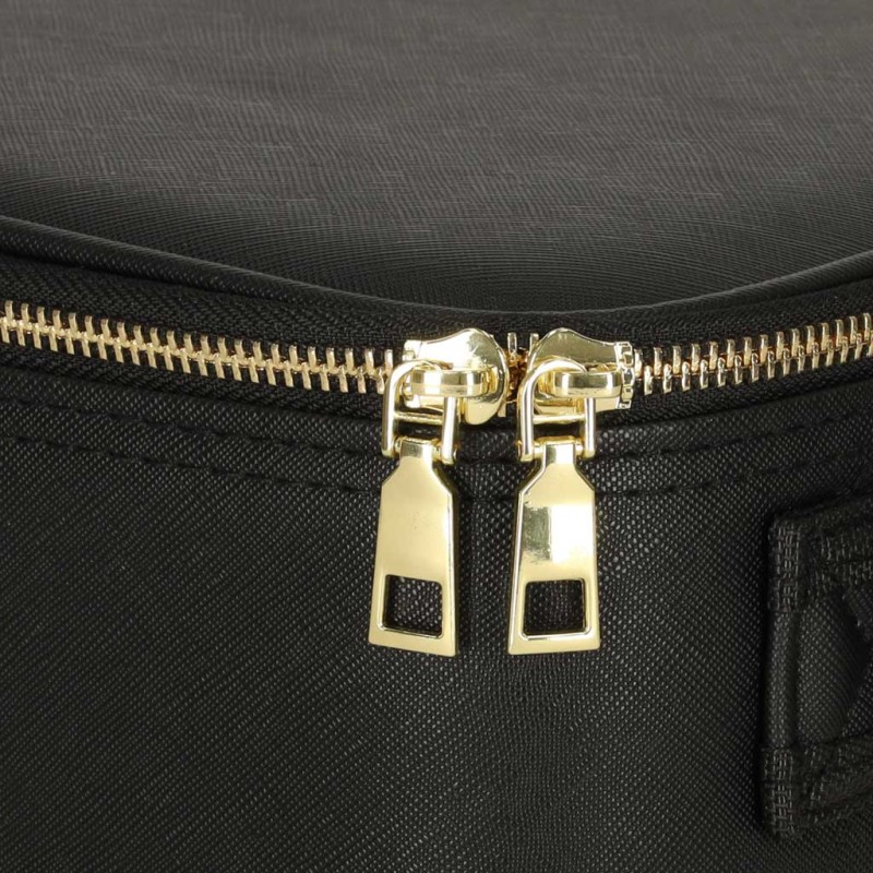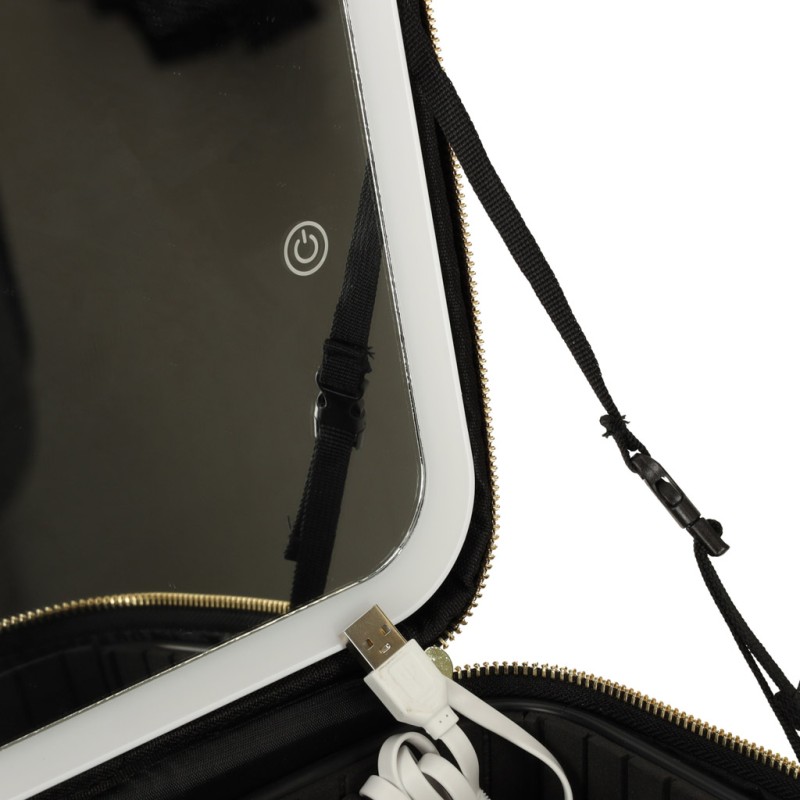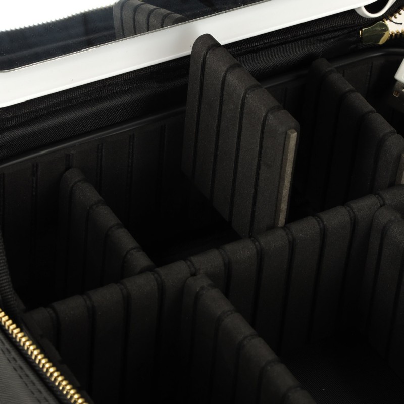 Czarna kosmetyczka podróżna będzie idealnym rozwiązaniem na kolejne podróże! Sprawdzi się doskonale nie tylko do przechowywania kosmetyków, ale także pomoże Ci wykonać precyzyjny makijaż w każdych warunkach – posiada lusterko z podświetleniem LED. Wewnątrz kosmetyczka ma wiele przegródek, które możesz dowolnie przekształcać, aby dopasować je do własnych potrzeb. W zestawie dodatkowo znajduje się kieszonka na pędzle czy inne drobne rzeczy.