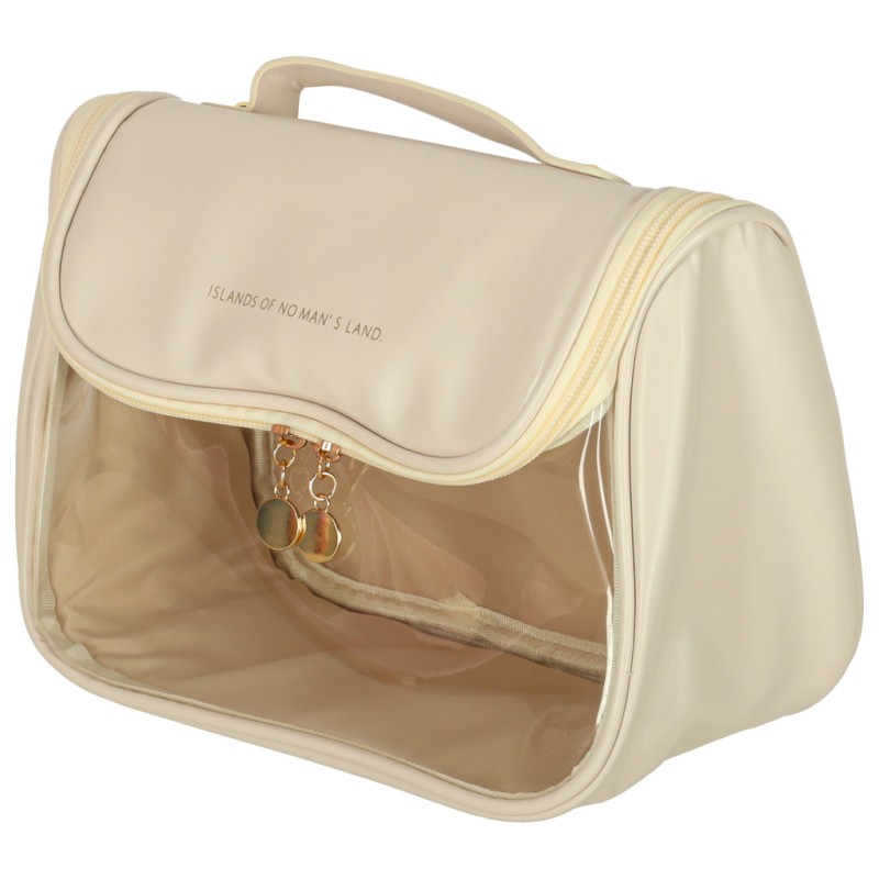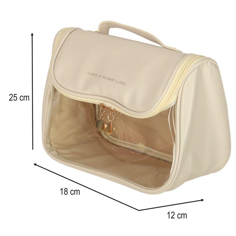 Beżowa kosmetyczka podróżna to idealne rozwiązanie dla Ciebie, jeśli cenisz sobie porządek i wygodę podczas podróży! Posiada pojemną główną przegrodę i praktyczną kieszonkę z siatki, które pozwalają z łatwością uporządkować ulubione kosmetyki i akcesoria. Zamek błyskawiczny gwarantuje, że spakowane przedmioty nie wypadną, a przezroczysty przód umożliwia szybkie odnalezienie potrzebnych produktów.