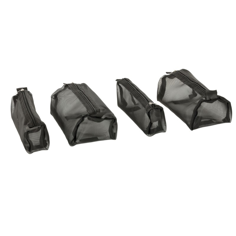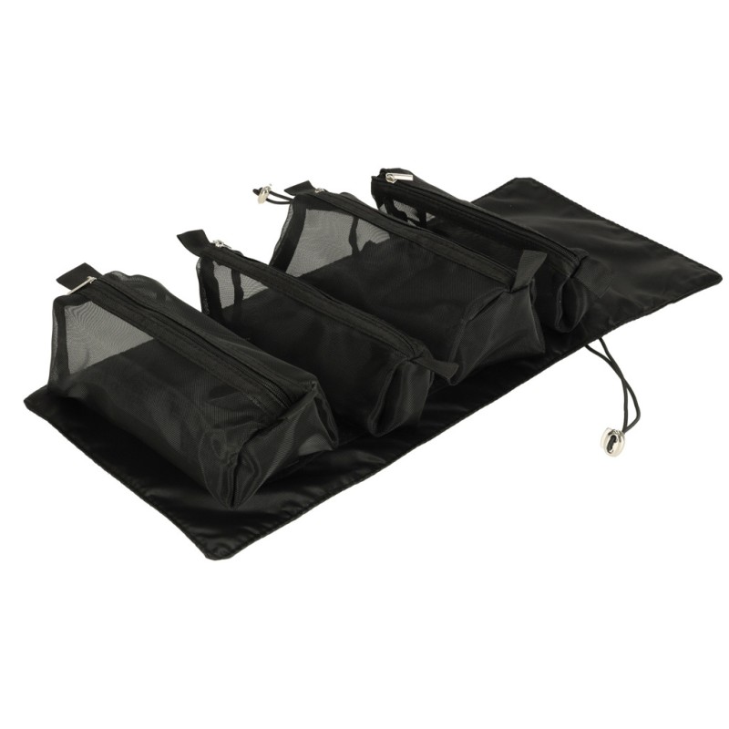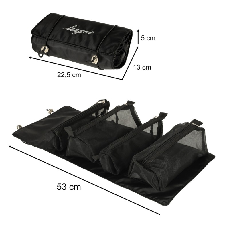 Czarna kosmetyczka podróżna. Można ją zwinąć w rulon, dzięki czemu zajmuje mniej miejsca w bagażu. Posiada cztery przegródki, które można wypiąć. Ścianki z siatki ułatwiają znalezienie kosmetyków. Długość kosmetyczki: 53 cm. Tworzywo: poliester.