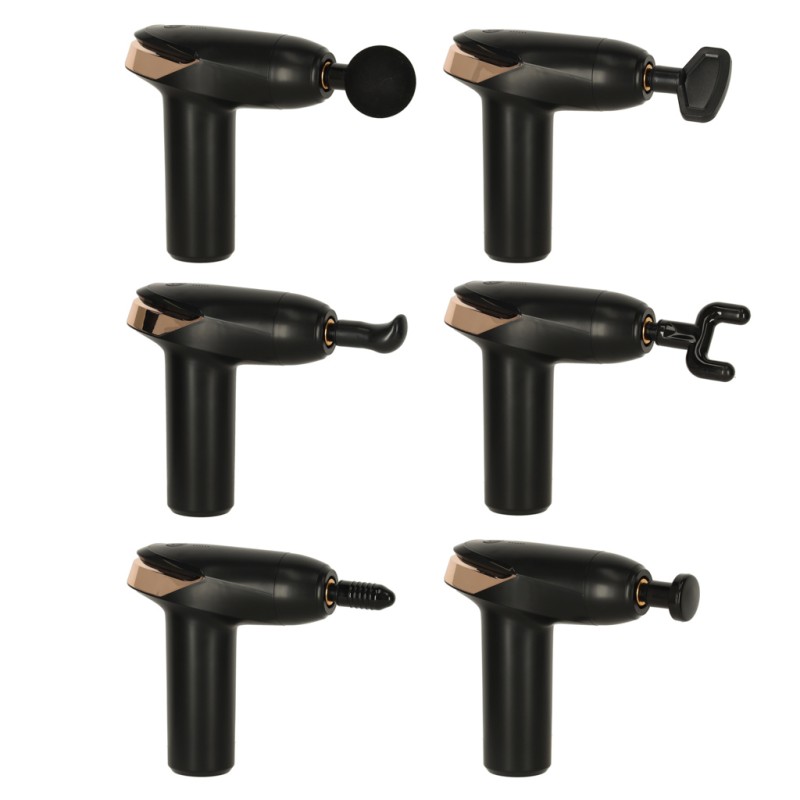 Masażer oferuje 6 poziomów intensywności — od delikatnych, relaksujących wibracji po mocniejsze uderzenia, które skutecznie pobudzają głębokie partie mięśni. Sześć wymiennych końcówek zapewnia optymalny masaż różnych obszarów ciała, aby każdy zabieg był maksymalnie efektywny.